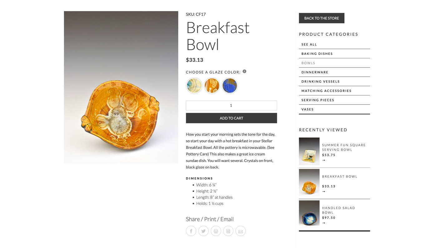 The main concept behind this online store was to get out of the way and let the pots do the talking. The beautiful glazes and the exquisite forms needed only a clean layout to shine.