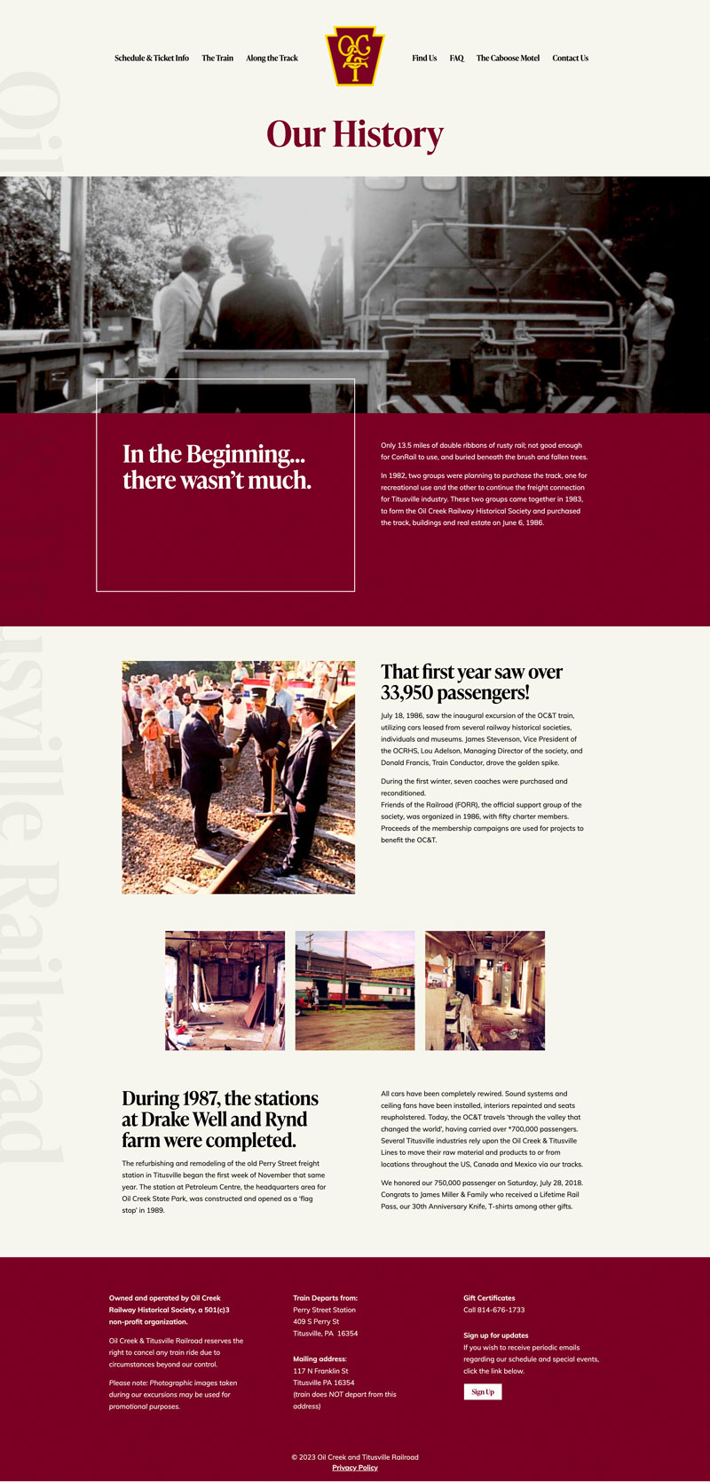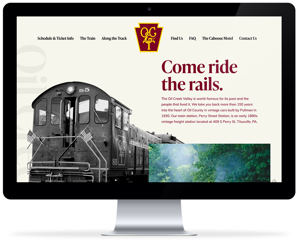 Oil Creek and Titusville Railroad had a website that looked older than its locomotives. And they're from the 50s. A new look and feel was develop to reflect the adventure factor of riding a vintage train through some of the most iconic landscapes in PA.