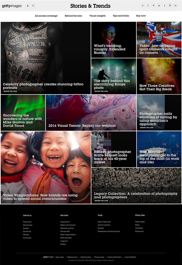 The grid layout features visual resources from Getty Images and allows for writers and staff to highlight specific articles simply by changing their position and size on the grid.